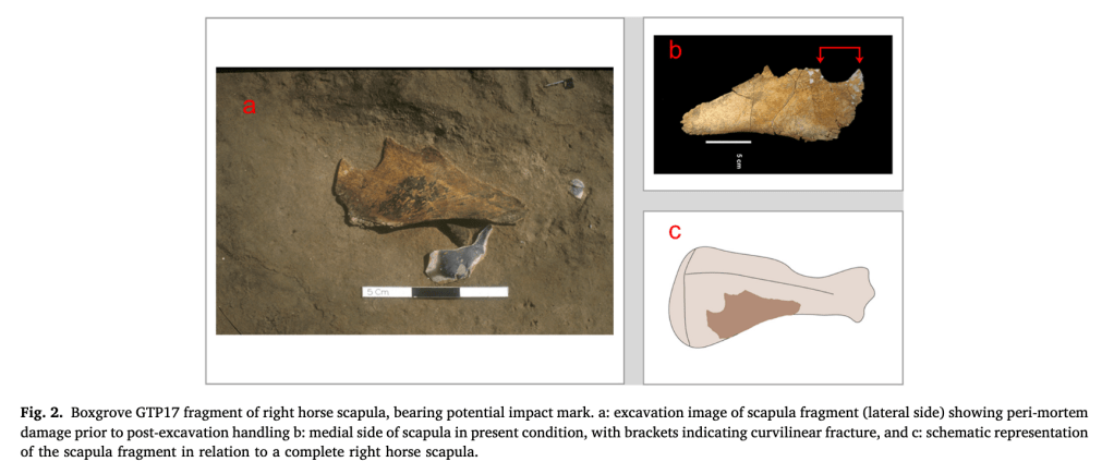 When I first began my PhD, I set out to understand early wooden weapons—not just what they looked like, but what they could do. Wooden spears rarely survive in the archaeological record, and discoveries of them have challenged our assumptions about the technological and hunting abilities of early humans. When I started my research journey, one prevalent narrative of early wooden spears was that they were unlikely to be effective hunting tools, and particularly as distance weapons. However, much of what underpinned that interpretation was anecdotal, or based on inconsistent research. Our latest paper, published in Quaternary International, is one piece of puzzling together empirical data on this question, representing an investigation into a fragment of a single horse scapula (shoulder blade) from Boxgrove, a Middle Pleistocene site in southern Britain dating to around 480,000 years ago.